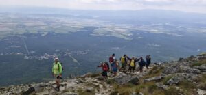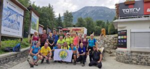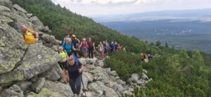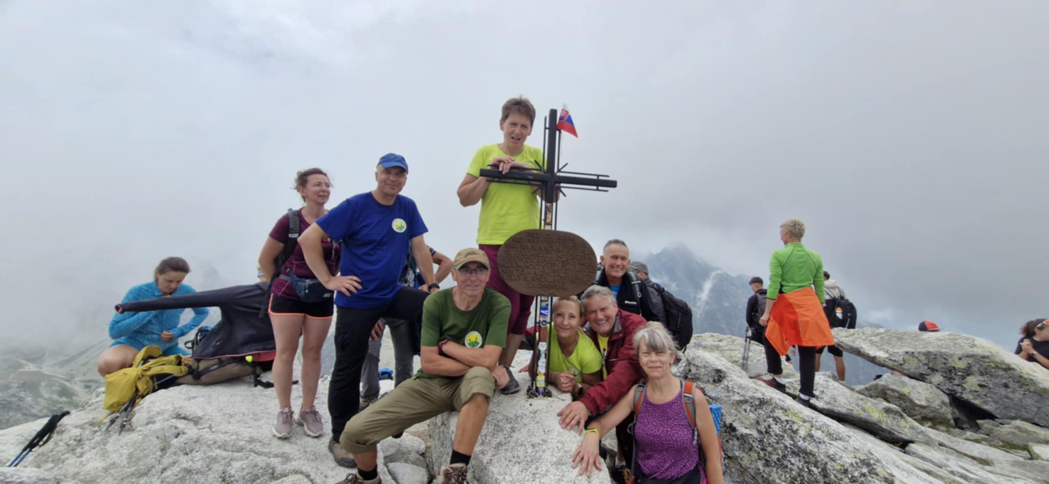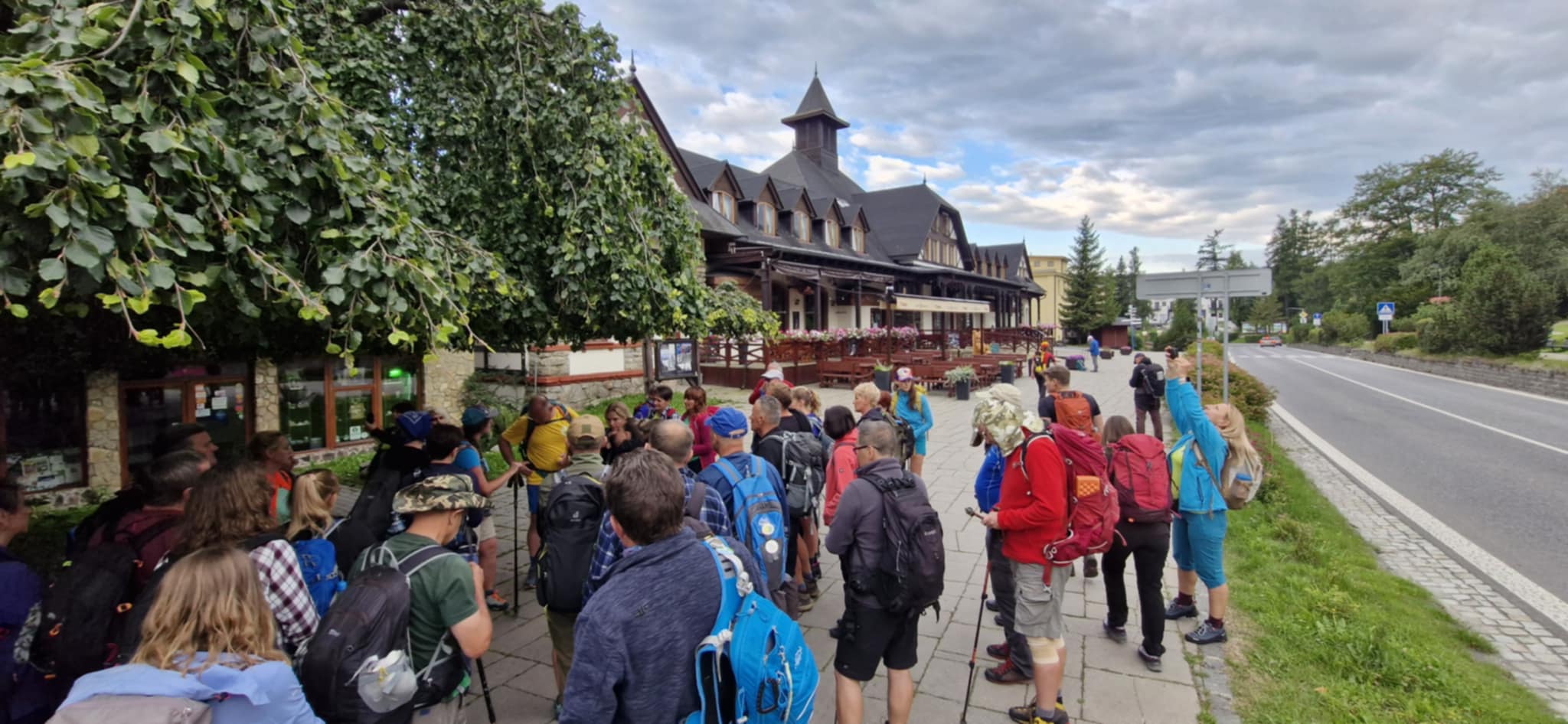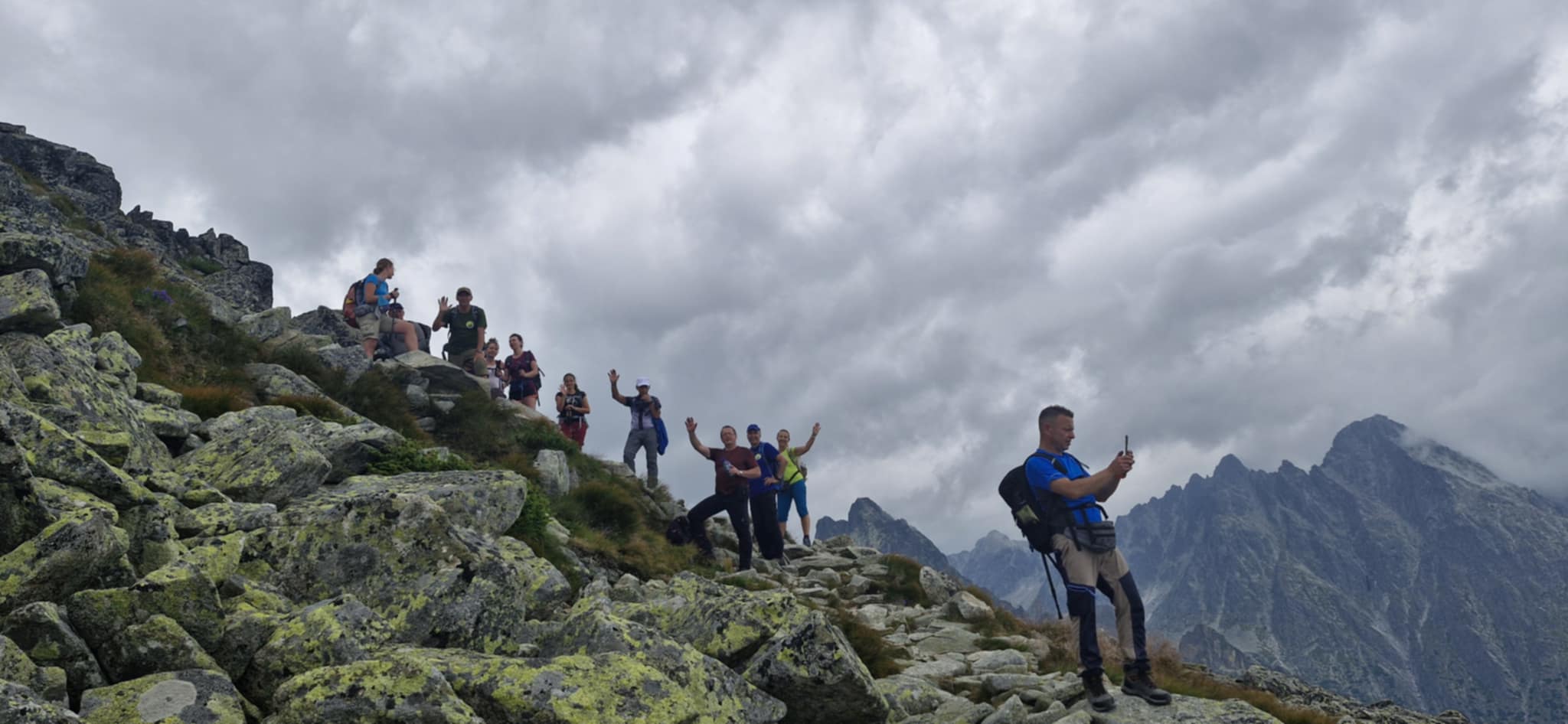 Pogoda na weekend zapowiada się bardzo korzystnie więc pakujemy dobre humory i ruszamy w Tatry Słowackie Wyjeżdżamy o 2.00 w nocy, by wcześnie rano wyjść na szlak. Już z oddali Tatry ukazują nam swoje piękno i zapraszają do swojego królestwa – to będzie fajny dzień. Po drodze zabieramy naszą przewodniczkę, Marysię i docieramy do Starego Smokowca. Mała grupa udaje się na Hrebienok, wodospady i Tatrzańską Magistralą do Domu Śląskiego. Jednak zdecydowana większość chce zmierzyć się ze Sławkowskim Szczytem. Szlak od samego początku daje mocno popalić: jest stromo i mozolnie. Przecinamy Tatrzańską Magistralę, a szlakówka pokazuje, że do szczytu mamy jeszcze 4,5 godziny…. Mijamy punkt widokowy zwany Maksymilianką, nabieramy wysokości i powoli idziemy naprzód. Cały czas towarzyszą nam widoki na masyw Łomnicy i Pośredniej Grani. Słońce schowało się za chmury, jakby chciało dać do zrozumienia, że teraz pora skupić się na patrzeniu pod nogi a nie na tatrzańskie krajobrazy. W końcu po 5,5 godz. docieramy na szczyt. Sławkowski Szczyt mierzy 2452 m n.p.m. i należy do Wielkiej Korony Tatr. Na szczycie znajduje się metalowy krzyż z tablicą pamiątkową, upamiętniającą pierwszych zdobywców w 1664 roku. Jest to trzeci pod względem wysokości tatrzański szczyt dostępny dla turystów (po Rysach i Krywaniu). W przeszłości był uważany za najwyższy w Tatrach, jednak istnieje hipoteza, że w XVII w. rozpadł się na skutek gigantycznego obrywu spowodowanego długotrwałymi opadami i być może lokalnym trzęsieniem ziemi, przez co wierzchołek stracił ok. 300 m. Śladem obrywów skalnych miały być rumowiska na stokach góry. Hipoteza ta nie została jednak potwierdzona naukowo. Szczyt wita nas mgłą i chmurami. To jednak nie zniechęca nas, by robić zdjęcia, bo przecież każdy chce mieć dowód, że udało mu się wejść. Rozsiadamy się i posilamy, a ponieważ widoków brak, nasza przewodniczka Marysia odpala aplikację do unoszenia chmur. Nie wszyscy wierzą w jej działanie, więc zniecierpliwieni schodzą w dół, a ci którzy zostali, przekonują się, że naprawdę działa. Wkrótce niebo się rozjaśnia i ukazują nam się niesamowite tatrzańskie panoramy. Pięknie prezentuje się Dolina Staroleśna oraz najbardziej znane szczyty, m.in. Lodowy, Wielki Jaworowy, Mała Wysoka, Rysy, Staroleśny, a nawet częściowo odsłania się Gerlach. Sesja zdjęciowa trwa długo, ale pora wracać. Piękne widoki towarzyszą nam przez całą powrotną drogę. Docieramy do Starego Smokowca. Jeszcze ostatnie zdjęcia z banerem i ruszamy.