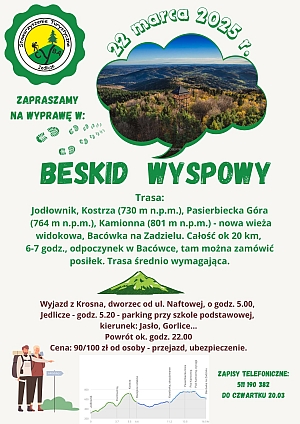 Zapraszamy na 20-to kilometrową trasę po Beskidzie Wyspowym. Szczegóły na plakacie. Trasę z Krosna do Jedlicza ustalimy po zapisach. Proszę dzwonić w godzinach od 10.00 do 17.00. Ps: Kostrzę można obejść.